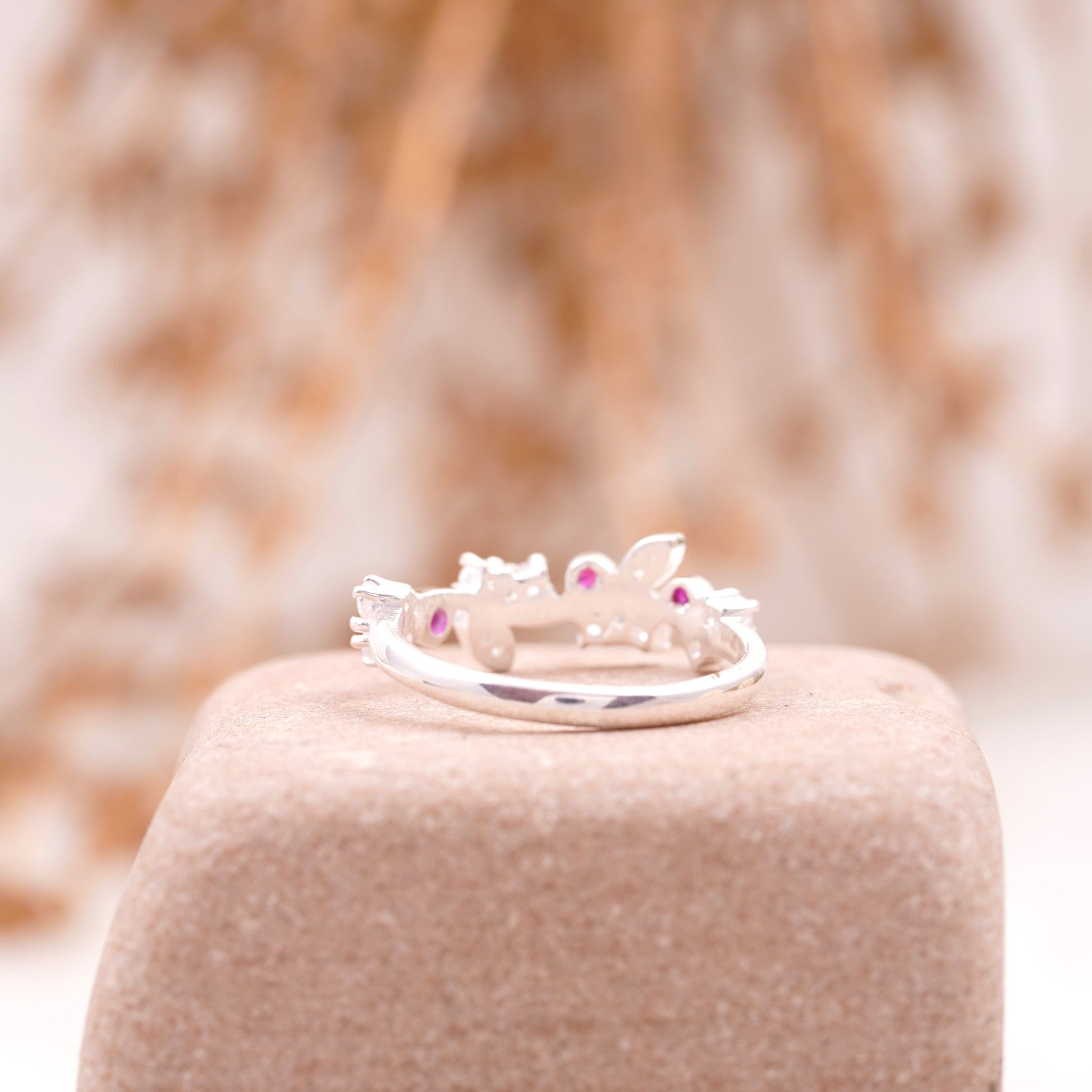 Nature Inspired Leaf CZ Diamond And Ruby Wedding Band 925 Sterling Silver