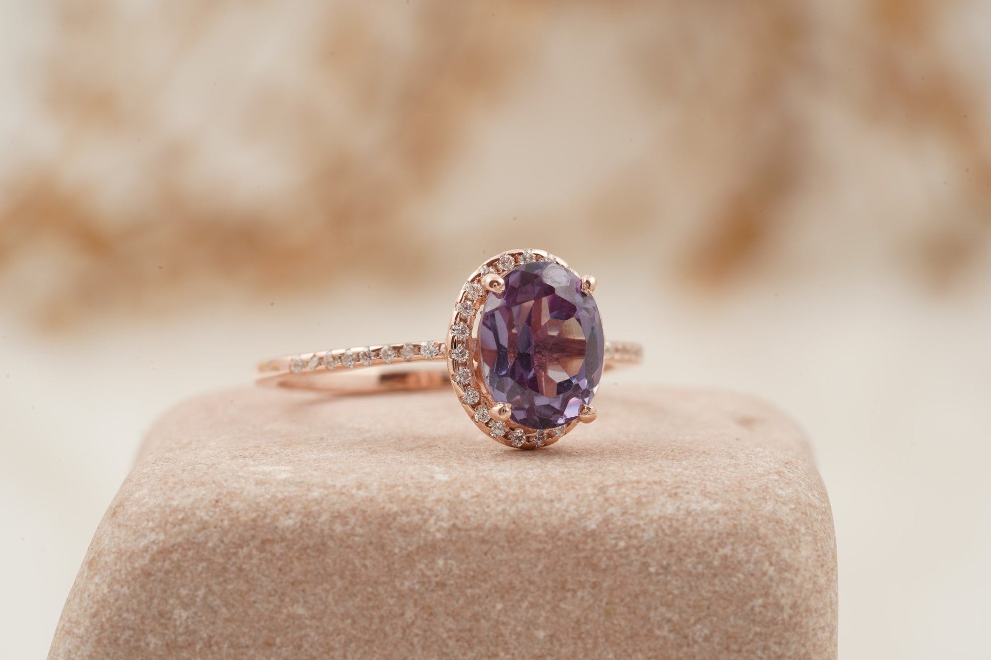 Oval Alexandrite Color-Change Stone 14K Rose Gold Halo Diamond Engagement Ring